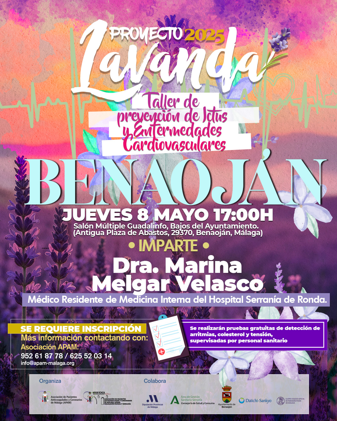 La Asociación de Pacientes Anticoagulados y Coronarios de Málaga (APAM) organiza la VI Edición del Proyecto Lavanda, una iniciativa centrada en la prevención y la promoción de la salud cardiovascular bajo el lema “De la prevención a la acción en salud cardiovascular”.