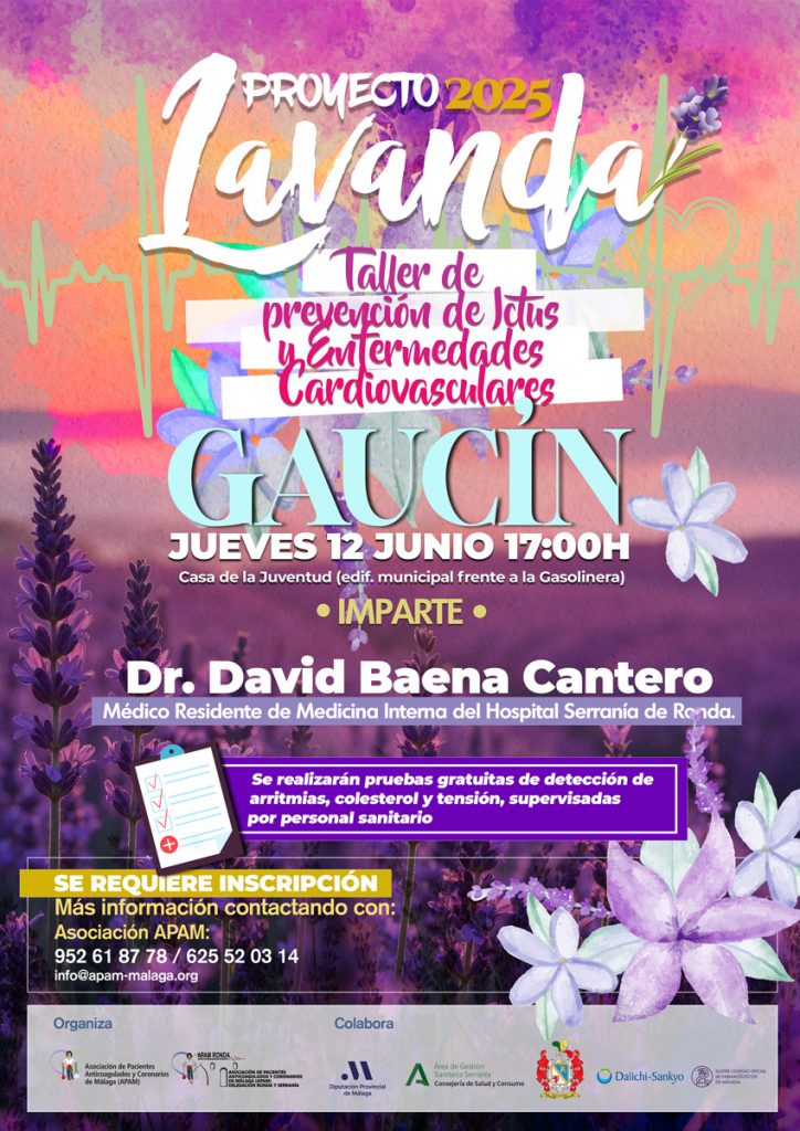 - Taller prevención del Ictus Gaucín 12 juniopor admin¡Te invitamos a participar en una nueva edición del Proyecto Lavanda: Promoción de la Salud Rural en Gaucín!La Asociación de Pacientes Anticoagulados y Coronarios de Málaga (APAM), junto con su Delegación en Ronda y Serranía, ofrecerá uno de los talleres de la V Edición de este importante proyecto, en el que colaboran activamente con la Diputación de MálagaEl objetivo principal es promover la prevención de la enfermedad cardiovascular (ECV) en toda la población, tanto para quienes ya están diagnosticados como para quienes aún no lo están