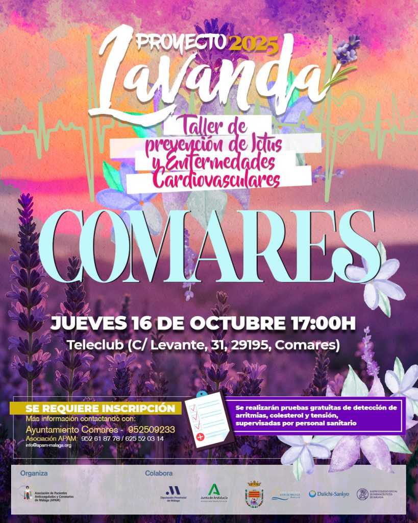 - Taller prevención del Ictus Comares 16 Octubrepor admin¡Te invitamos a participar en una nueva edición del Proyecto Lavanda: Promoción de la Salud Rural en Comares! La Asociación de Pacientes Anticoagulados y Coronarios de Málaga (APAM), ofrecerá uno de los talleres de la V Edición de este importante proyecto, en el que colaboran activamente con la financiación de la Diputación de MálagaEl objetivo principal es promover la prevención de la enfermedad cardiovascular (ECV) en toda la población, tanto para quienes ya están diagnosticados como para quienes aún no lo están
